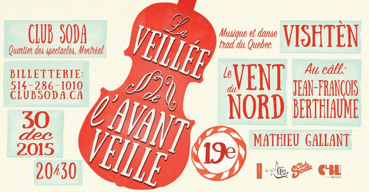 Évènement annuel incontournable de la période des fêtes, la 19e édition de La Veillée de l’avant-Veille se tiendra le mercredi 30 décembre au Club Soda de Montréal. Le Vent du Nord sera à nouveau l’hôte de cette Veillée de musique et danse en 3 temps en compagnie de Vishtèn, Mathieu Gallant et de Jean-François Berthiaume.  C’est en mode plus que festif que La Veillée de l’Avant-Veille met en scène une répétition générale du Jour de l’An, prétexte idéal d’une soirée mémorable dans une ambiance unique au Québec. Venez en famille, entre-amis.