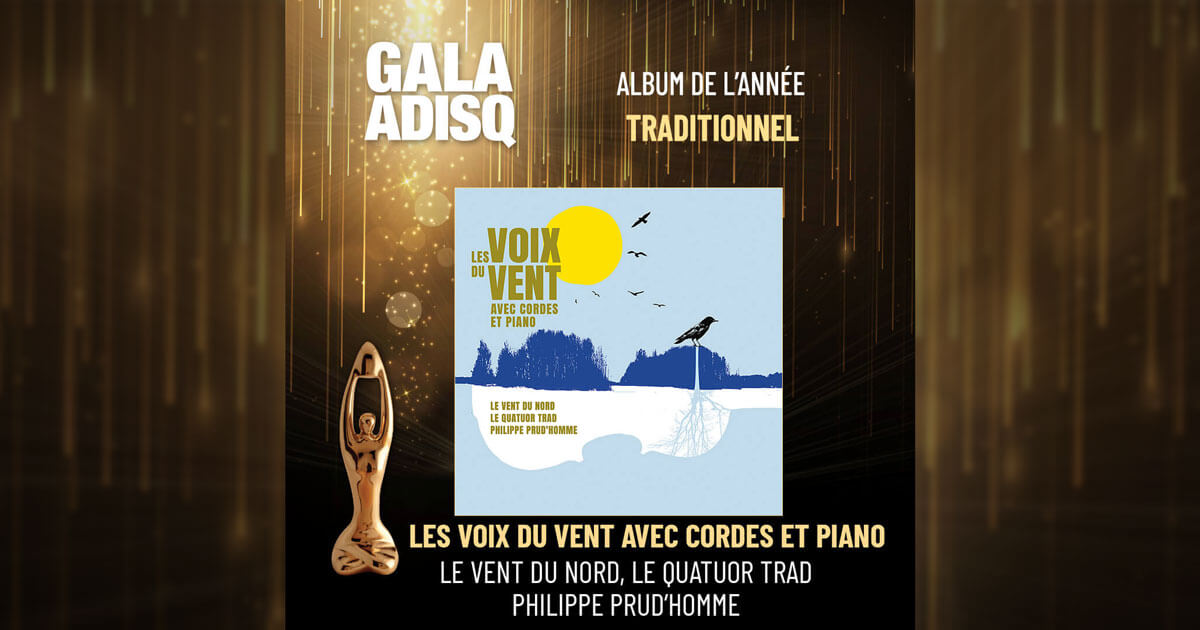 Ce mercredi 1er novembre, l’ADISQ a récompensé de nombreux artistes, professionnels et artisans de l’industrie de la musique. C’est 45 trophées Félix qui ont été remis à ceux et celles qui donnent vie à la chanson, à la musique et à l’humour d’ici. Pour notre plus grand bonheur, et non sans surprise, l’album Les Voix du Vent avec cordes et piano a été récompensé du FÉLIX Album Traditionnel de l’année lors du Premier Gala de l’ADISQ – diffusé sur les ondes de Télé-Québec *. La réalisation de cet album trad-classique en compagnie du Quatuor Trad (Marie-Pierre Lecault, Émilie Brûlé, Sophie Coderre et Josianne Laberge) et du pianiste Philippe Prud’homme a été un véritable cadeau. Merci aux membres du jury et à tous nos collaborateurs qui ont permis de concrétiser ce projet audacieux! Notamment René Aubé et Ghyslain-Luc Lavigne du Studios Piccolo à Montréal.