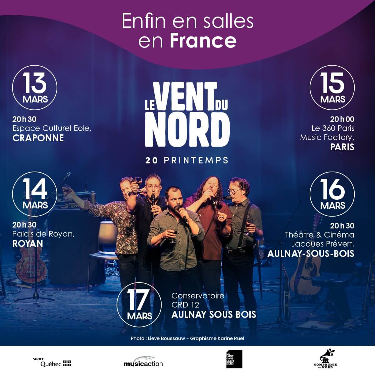 Nous sommes très heureux d’annoncer le passage de la tournée 20 Printemps du groupe québécois Le Vent du Nord en 5 salles de France entre le 13 et le 17 mars 2025.